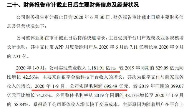 根据最新招股书,2020年前三季度,蚂蚁集团的营收为1181.91亿元,同比增长42.56%;毛利润为695.49亿元,同比增长74.28%;整体毛利率则从2019年同期的48.13%增至58.84%。