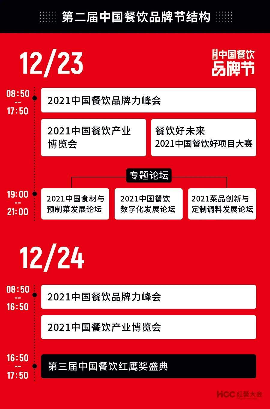 在首届品牌节的基础上,第二届中国餐饮品牌节进行了优化升级,特别设置了“2021中国餐饮品牌力峰会”、“第三届中国餐饮红鹰奖盛典”、“餐饮好未来——2021中国餐饮好项目大赛”以及“2021中国餐饮产业博览会”四大版块内容。
