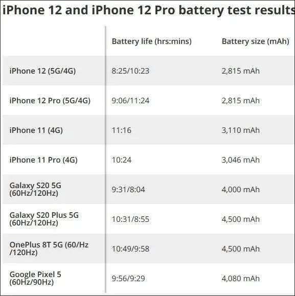 除了价格的问题,苹果此次发布的新机也存在电池续航的问题。苹果官网上宣称iPhone 12视频播放最长可达17小时,音频播放可达65小时。但美国硬件网站Tom's Guide在测试了苹果公司新机iPhone 12后发现,开启5G后iPhone 12的续航时间锐减。结果显示,iPhone 12和iPhone 12 Pro在5G模式下的续航时间均比4G模式要少两个小时左右。