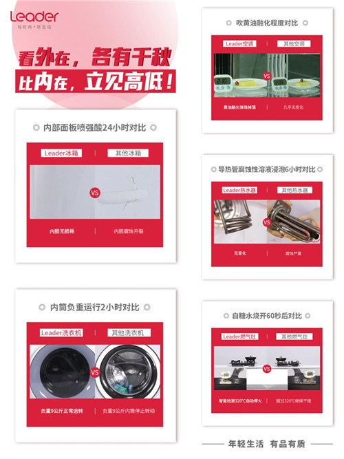 另外,Leader不仅用料扎实,还通过技术创新使产品具备高效、智慧等特点。在横评对比实验中,Leader大胆与其他品牌PK,证实自己的产品实力。Leader冰箱和普通冰箱接受喷强酸24小时,结果Leader冰箱内胆无损耗,普通冰箱内胆则腐蚀开裂;Leader洗衣机与普通洗衣机内筒负重9公斤运行2小时,Leader洗衣机还能继续运转,普通洗衣机不再运行;Leader热水器与普通热水器导热管腐蚀性溶液浸泡6小时,Leader热水器导热管无变化,普通热水器早已锈迹斑斑......这不仅展示其优秀性能,更展示了Leader对自身产品的强大自信。