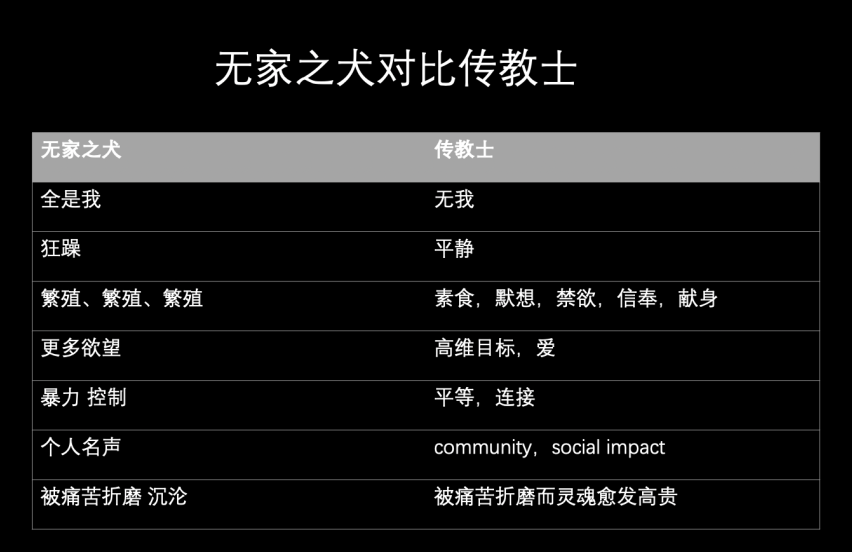我们对比一下无家之犬和传教士两种不同的行为及思考模式。