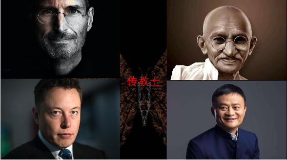 这也是我们大家非常熟悉的这些传教士,包括商业的传教士,从乔布斯、Elon Musk、马云、圣雄甘地等等。甘地是非常有趣的人,圣雄的意思是代表伟大的灵魂。圣雄曾经讲过几句非常有趣的话,他说我是伊斯兰教,我也是印度教徒,我是基督教,我也是犹太教。他认为所有的宗教都应该平等,不应该因为大家神的不同而互相歧视。