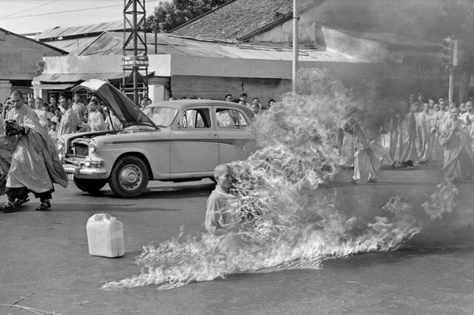 越南的一位得道高僧叫释广德,当时因为南越政府的总统是天主教徒,对佛教非常不认同,打压佛教。在1963年6月的一个清晨,释广德走上大街,弟子在他身上浇上汽油,然后静静坐在那里点燃自己,然后在熊熊大火中燃烧自己。