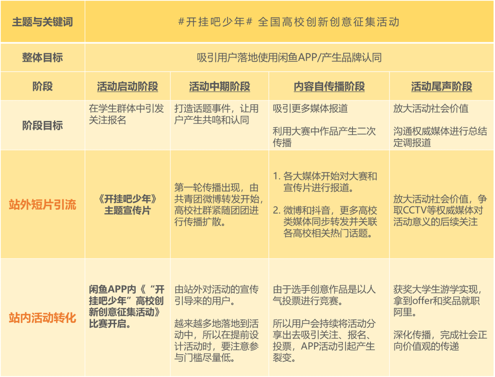 从图中不难看出,闲鱼打造《开挂吧少年》活动的主要部分并不复杂,是一个典型的利用 站外引流+站内活动 两部分组成的活动。