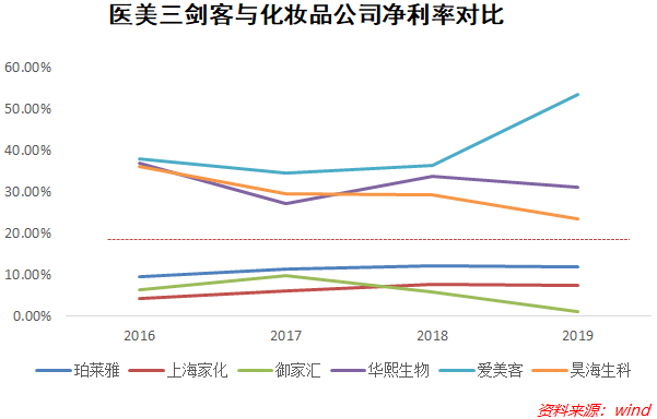 可以看到,同样销售与美相关的产品,医美三剑客华熙生物、爱美客、昊海生科无论是在毛利率还是净利率方面,全部都远高于销售化妆品、护肤品的公司珀莱雅、上海家化、御家汇。总有人跟我说面膜等化妆品是暴利行业,但没想到的是玻尿酸等医美产品更加暴利,上市公司中能够达到毛利率90%水平的恐怕只有贵州茅台等高端白酒公司了。