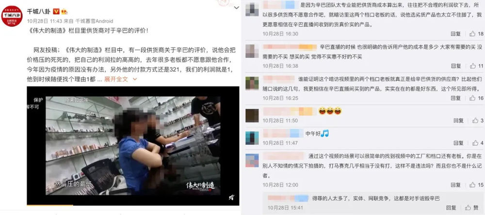 在某档节目上,有供货商表示不愿意跟辛巴合作,因为他过于压低供货商利润,并且掌握绝对话语权。但在评论区却全部沦陷为辛巴喊话,可见辛巴的粉丝忠诚度与粘性仍然很强。