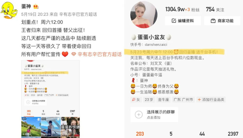 在今年5月辛巴退网期间,旗下主播蛋蛋就打着“替父出征 回归首播”的口号在快手开播,开播55分钟销售额突破一个亿。期间,初瑞雪连麦进入直播间,转达了辛巴对蛋蛋的寄语,并要求蛋蛋不要提辛巴的名字。在这场直播过程中,蛋蛋虽然没有提辛巴的名字,但一直不断提起“师父”、“爹”。不断煽情的情况下,粉丝们也狂刷818,几乎成了一场纪念辛巴的专场。