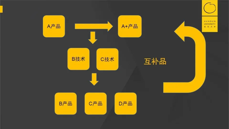 如果要做A产品,把做得非常好,超乎用户预期,这个过程中可能会遇到一些技术限制和瓶颈,那么就去研发和攻克这些难关。这些难关一旦攻克以后,技术本身又可以产生新的产品,这些产品和原有产品就形成了互补品,形成一个创新的产品矩阵。