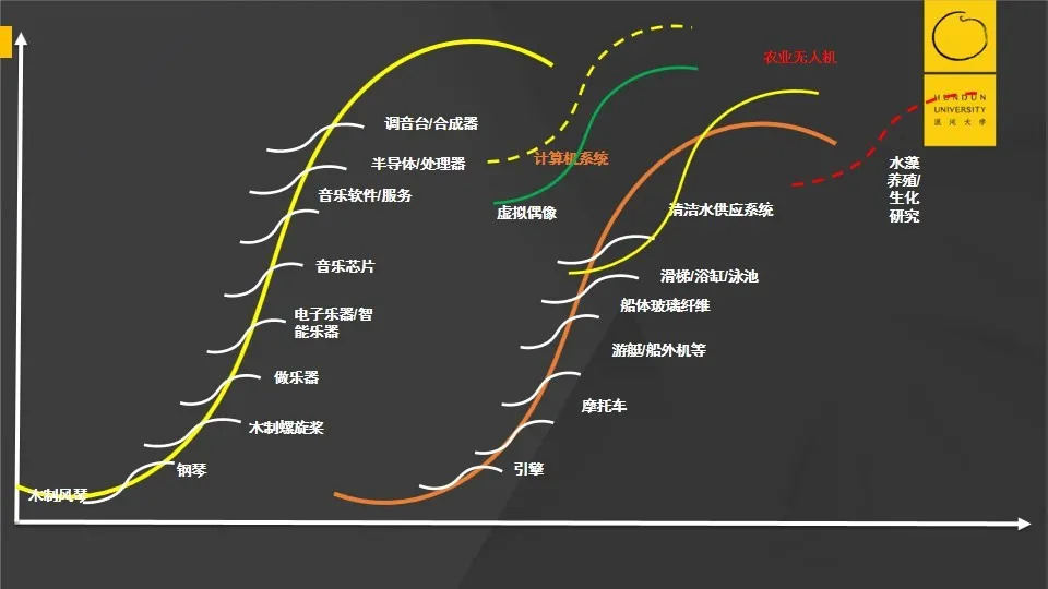 比如雅马哈去做乐器,要做电子乐器,必须要攻克一些电子信号的设备,还有路由器等网络设备。当这些创造出来以后,它就有了网络事业部,然后就可以创造一些合成软件。在一些音乐合成软件的基础上,最后就创造出了那个非常挣钱的虚拟偶像初音未来。
