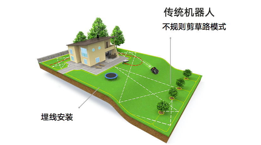 前期埋设线圈的工作不仅费时费力,同时也会破坏草坪平整度,且设施相对固定,无法做到灵活部署和移除。除此之外,传统自动剪草机不能实现路径检测和规划,剪草的“随机性”同样被使用者诟病。