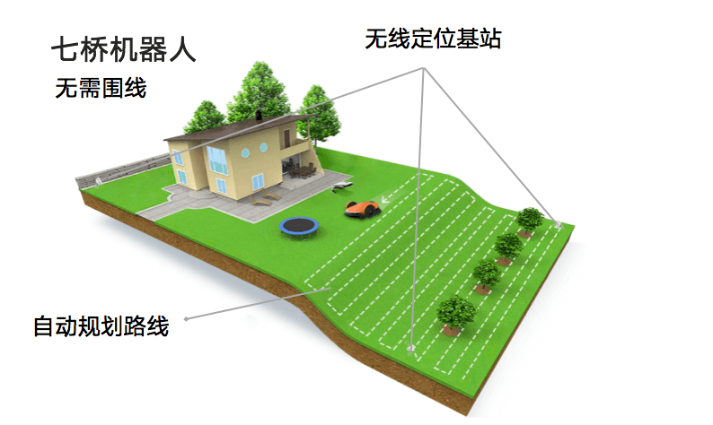 七桥机器人利用UWB(超宽带)技术实现了剪草机器人的精准定位,UWB技术有着数据传输快、定位精确、抗干扰能力强、低功耗等特点,与GPS给出的绝对地理位置不同,UWB技术可以利用超短脉冲给出相对位置,其定位精度可达厘米级。