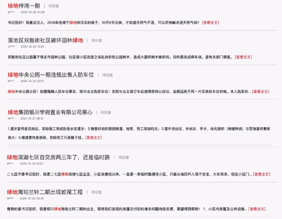 在人民网地方领导留言板上,搜索“绿地”,弹出的几条留言都是近一周内绿地的业主们发布的消息。要么是交房后房屋质量和配套不善,要么是违规出售人防车位,还涉及到地方项目公司违规宣传等问题。
