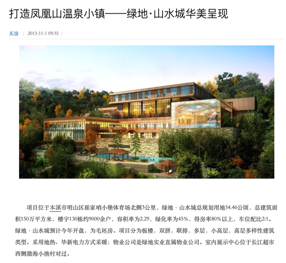2012年,绿地·山水城在辽宁本溪本地以3800元/平方米的价格开盘,背靠凤凰山,毗邻太子河,说是要在这片背山面水的土地上打造“温泉小镇”。