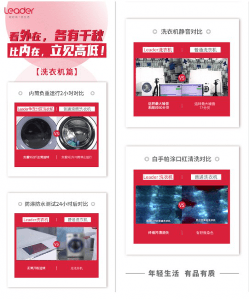 除此之外,Leader洗衣机还进行了一系列暴 力测试,检验自身品质。Leader洗衣机防水性能良好,在经过24小时的防淋防水测试后,Leader洗衣机能够正常开机;在静音测试实验中,Leader洗衣机的运转最大分贝在60分贝以下,非常安静;在洗口红实验中,Leader洗衣机能够洗净口红残余,达到纤维级洁净.....
