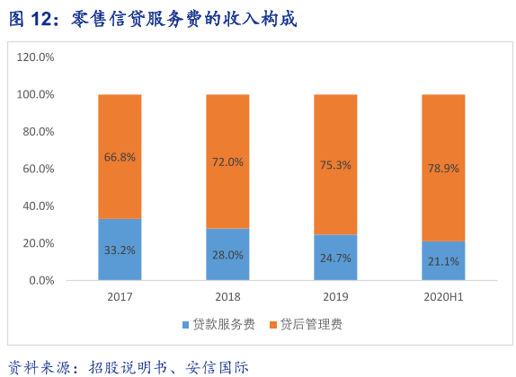 陆金所主要拥有两大主营业务,即零售信贷和财富管理,分别由平安普惠、陆金所平台运营。从收入结构来看,零售信贷服务费是陆金所最核心的收入构成部分,2019、20H1 占营收比例分别为 82.2%、80.8%。陆金所的信贷业务也是助贷模式,由第三方金融机构提供资金,陆金所为金融机构提供获客、评估、风控等服务,并收取服务费。