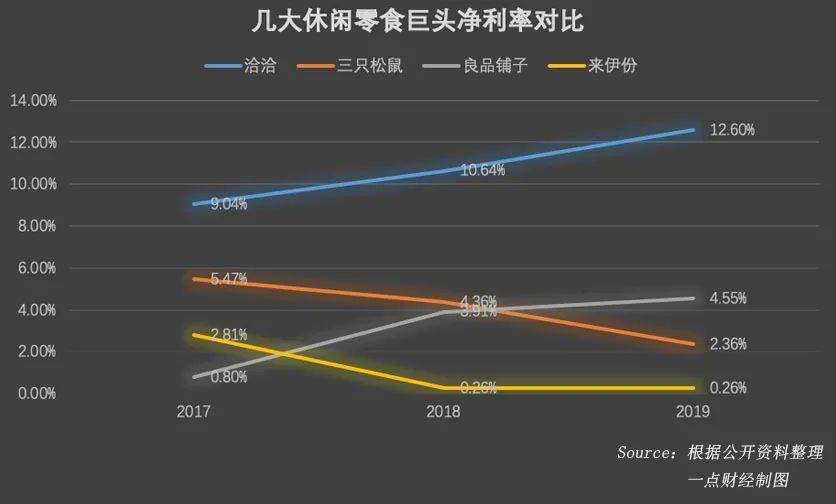 实际上,洽洽的净利率一直位居几大龙头榜首。万得数据显示,2017-2019年,洽洽净利率分别为9.04%、10.64%、12.6%;同期三只松鼠净利率为5.47%、4.36%、2.36%;良品铺子为0.8%、3.91%、4.55%;来伊份为2.81%、0.26%、0.26%。