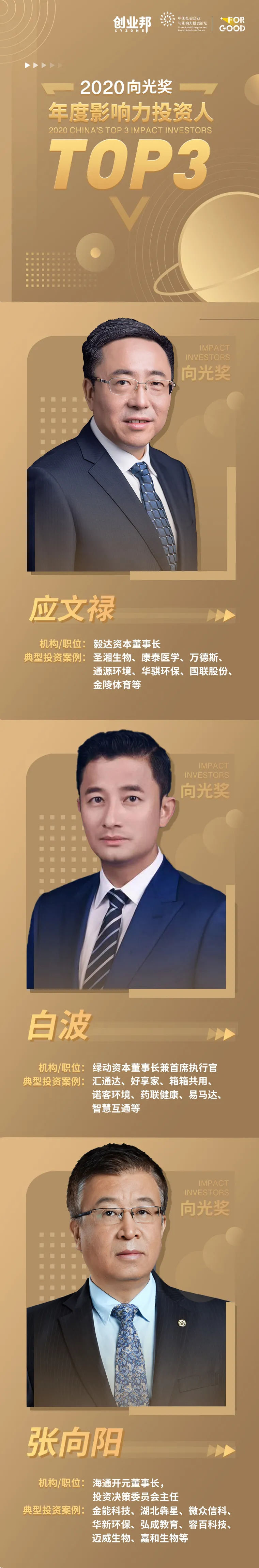 本次上榜的三位投资人是毅达资本董事长应文禄、绿动资本董事长兼首席执行官白波、海通开元董事长张向阳。最近一年来他们在影响力投资领域的卓越表现获得专家评审团的高度认可,是资本向善的引领者。