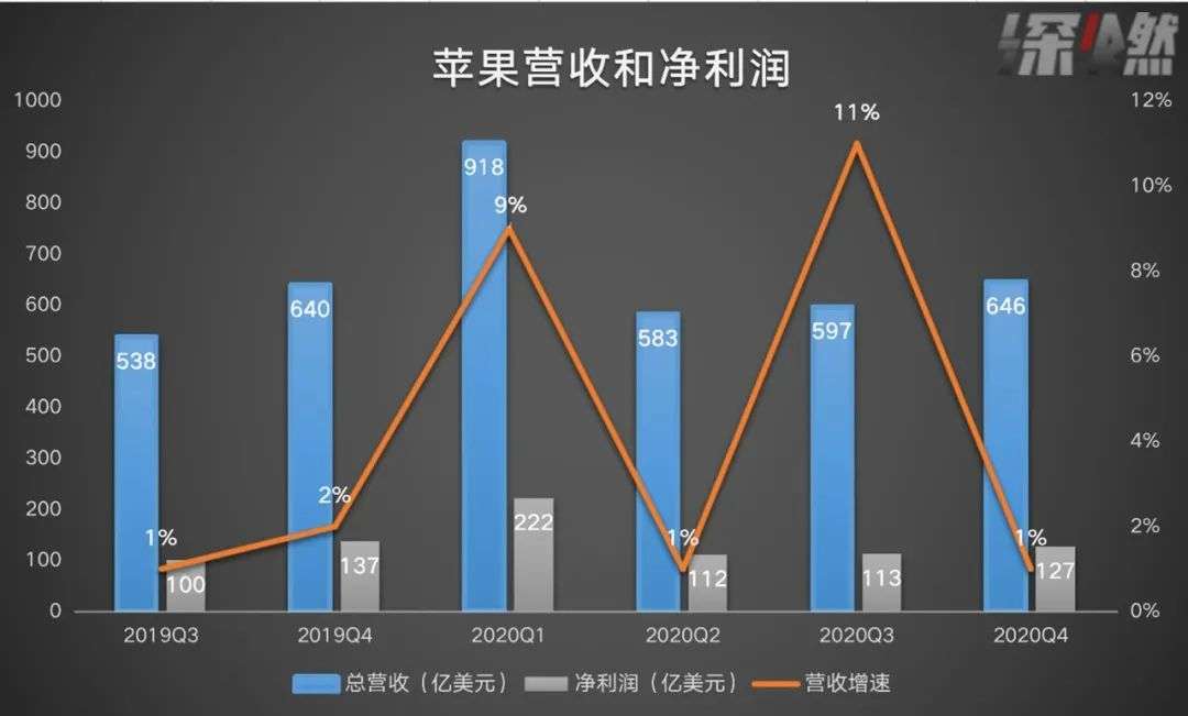 总的来看,苹果公司的2020财年第四季度(2020年第三自然季度)业绩在营收、利润方面的表现均超预期,营收647亿美元,同比微涨1%;净利润为127亿美元,与去年同期的137亿美元相比有所下降。