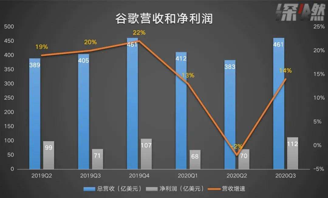 本季度,Alphabet的表现最为亮眼,截至2020年9月30日的第三季度财报显示,总营收为460亿美元,同比增长14%;净利润为112亿美元,同比增长59%。