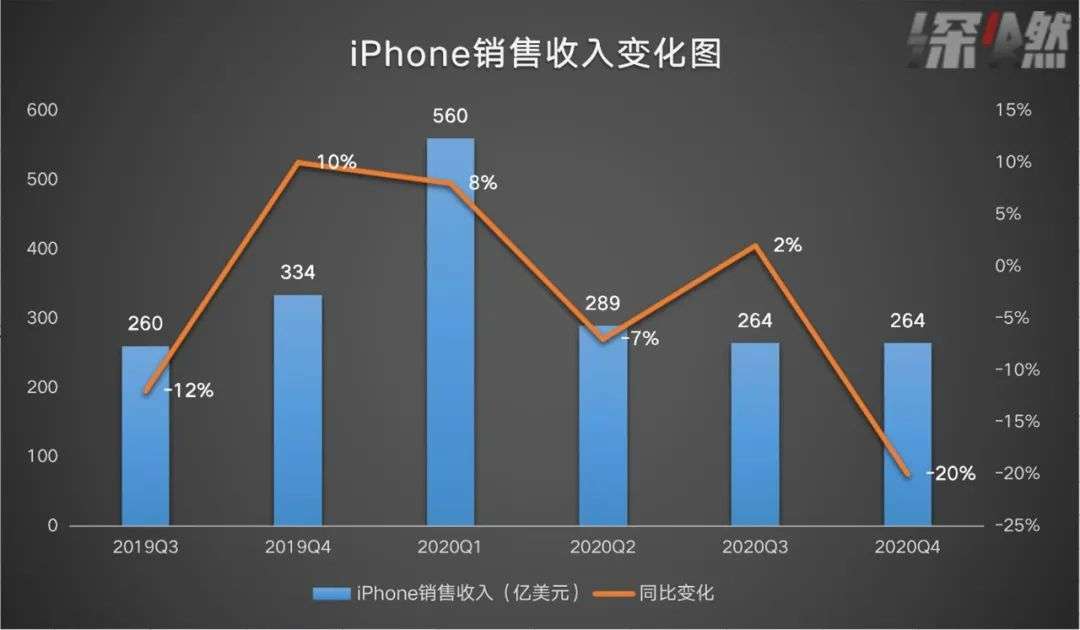 但苹果依赖的iPhone收入在本季度只有264亿美元,同比大跌20%。原因很简单,因为本季度财报记录的是7、8、9三个月的业绩,今年的iPhone 12延迟到10月才发布,首销金额不在今年的第四财季。
