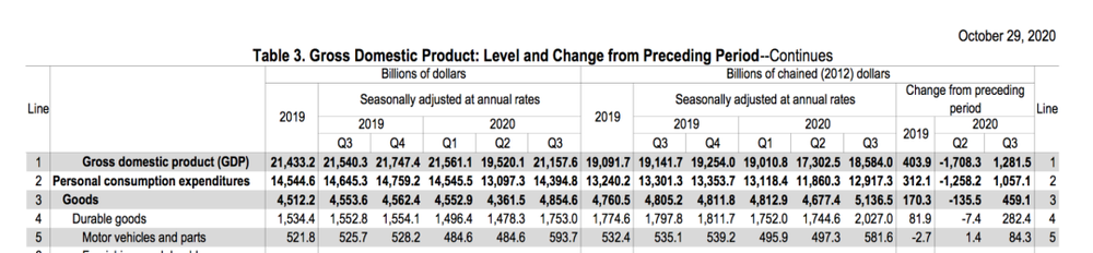 按固定价格计算,2020年Q3,比2019年Q3,同比下跌2.9%。2020年前三季度比2019年前三季度下跌3.9%,折算成金额大概少了接近6000亿美元吧。(按可变价格计算Q2Q3两个季度大概是5500亿美元GDP下降,其中Q2 4500亿美元,Q3 1000亿美元)