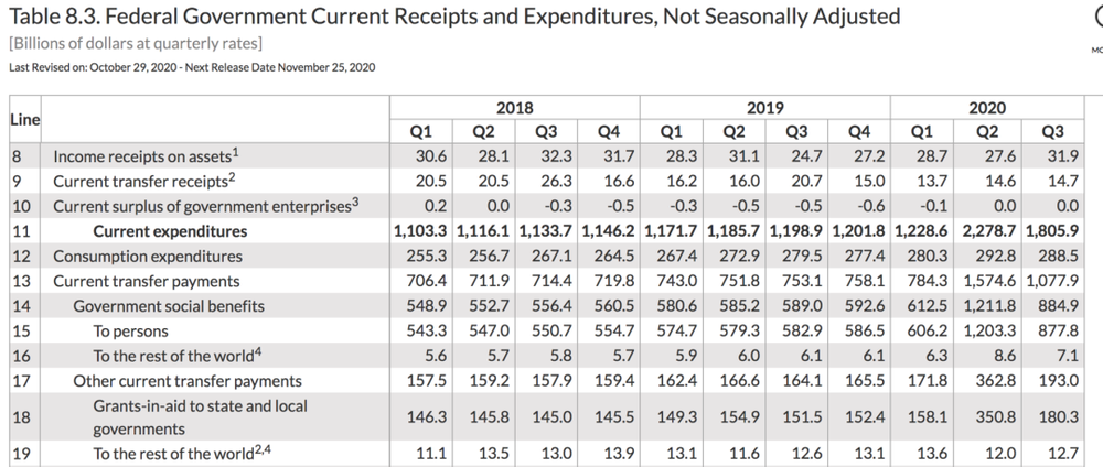 美国2020年Q2的联邦政府收入,同比下降7%。而支出,同比上升92%。Q3的政府支出同比上升51%。这两个季度,美国联邦政府比正常年份多支出了接近1.7万亿美元,其中二季度大概11000亿,三季度6000亿。(美国政府的所谓超3万亿美元的刺激计划,并不全部是反映到政府支出的财政刺激)