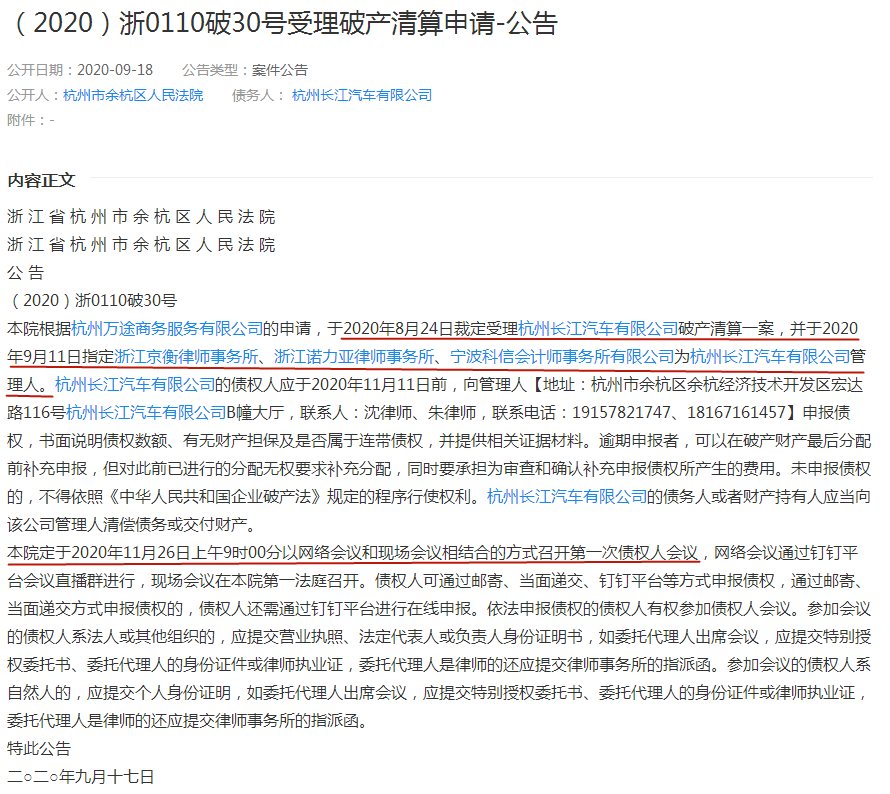 杭州市余杭区人民法院破产文书显示,杭州长江汽车有限公司被法院裁定进入破产清算程序。长江汽车的债权人需在11月11日前,向管理人申报债权,书面说明债权数额、有无财产担保及是否属于连带债权,并提供相关证据材料,杭州市余杭区人民法院将于11月26日召开第一次债权人会议。