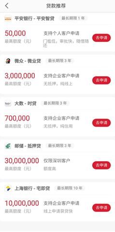 点击页面中“更多贷款服务”则导向平安银行(000001,诊股)、微众银行、邮储银行(601658,诊股)、上海银行(601229,诊股)、大数金融等机构旗下的贷款产品。
