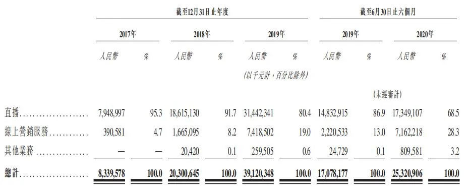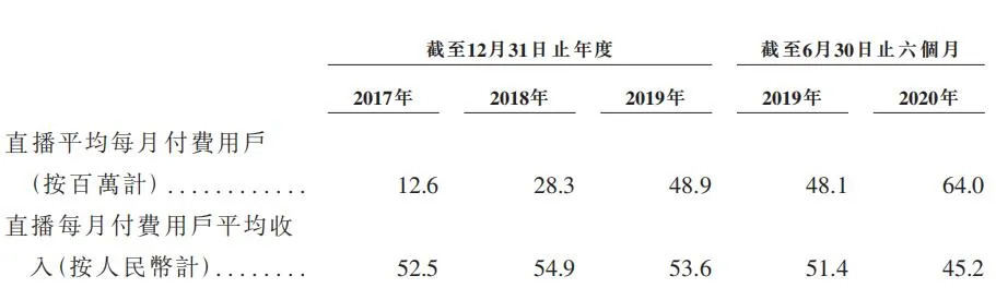 招股书显示,2017/2018/2019/2020H1,直播收入占总收入比例分别为95.3%、91.7%、80.4%和68.5%,直播月付费用户平均收入分别为为52.5元、54.9元、53.6元和45.2元。