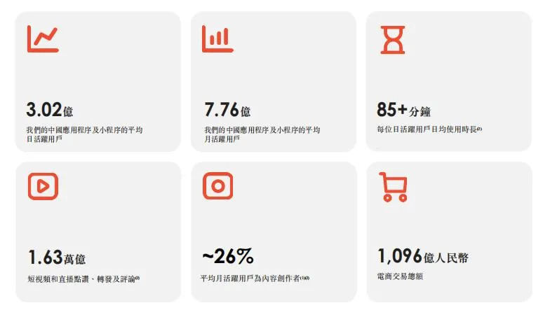 截至2020年6月30日的半年里,快手每月平均上传超过11亿条短视频,进行过近10亿次直播,有近80亿对互相关注,短视频和直播共有1.5万亿次点赞、1220亿条评论和60亿次转发量,平台商品交易总额达到1096亿元,日活跃用户花费超过85分钟,日打开率超过10次。