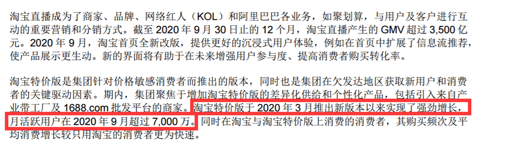 据财报披露,淘宝特价版在第三季度聚焦于“增加差异化供给和个性化产品”,包括引入来自产业带外贸工厂以及1688的商家,从2020年3月份推出新版以来,月活跃用户超过了7000万,相较于只用淘宝的消费者,同时在淘宝与淘宝特价版上消费的用户,购买频次和平均消费增长都有很大的促进。