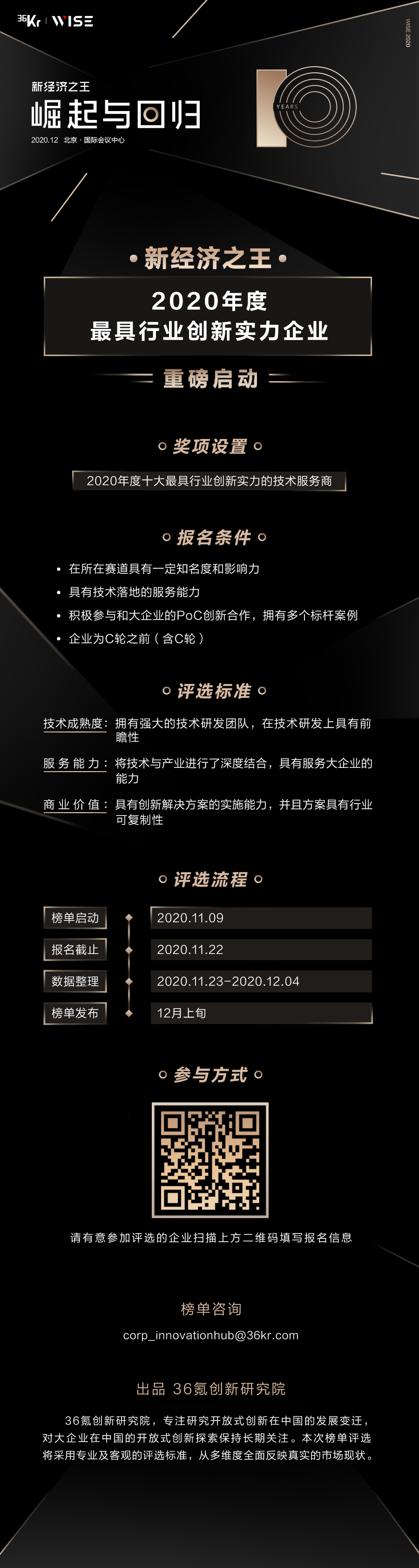 成立十年来,36氪始终致力于成为中国新经济行业最坚定和最持久的陪伴者。为此,36氪重磅启动「WISE-2020年度最具开放式创新力领军企业」评选,希望找到这些具备“开放式创新”力量的领军企业,以期褒扬那些透过市场变化,预见行业变革新动向,提前做出反应并行动的先锋企业。同时,我们也启动了「最具行业创新实力企业」榜单评选,寻找那些拥有强大的技术研发团队,在技术研发上具有前瞻性,具有极高商业价值的实力企业。