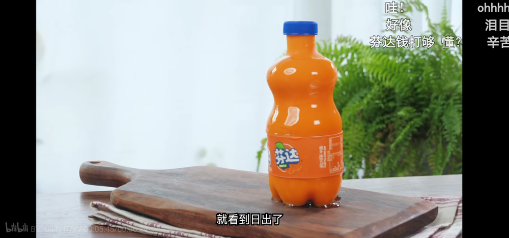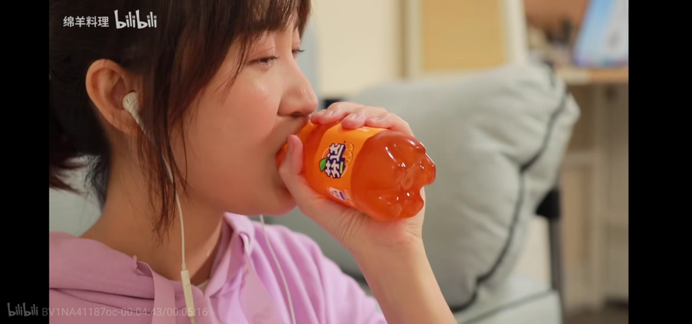 在B站美食UP主绵羊料理的美食视频片尾,绵羊在说完“炸鱼薯条配芬达”后顺势拿出一瓶芬达,这种明显是恰饭的流程却在她对着瓶身咬下一口时显得脑洞大开,原来这是她用芬达做的果冻, “猝不及防”的弹幕瞬间刷屏。