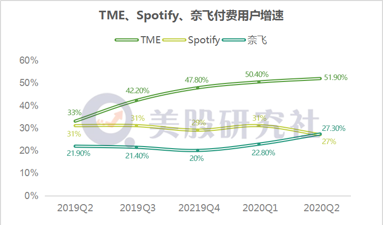 此外,值得注意的是,腾讯音乐的付费用户增速上已经连续5个季度跑出了国际第一,不仅高于Spotify,同时还高于国际视频流媒体巨头奈飞。
