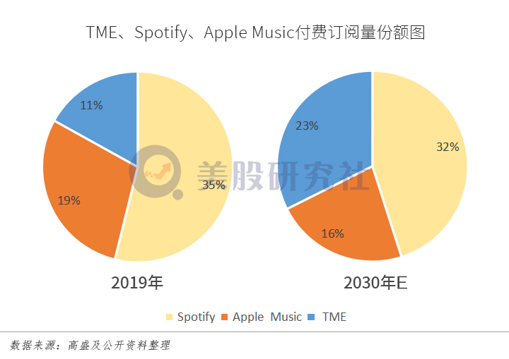 从整个流媒体市场来看,付费的趋势已经不可逆转。据高盛2019年预测,到2030年,全球将有11.5亿的付费流媒体用户。依据奈飞、Spotify、腾讯音乐等玩家目前的付费用户数来看,未来在付费用户的转化上依然存在不小的想象空间。
