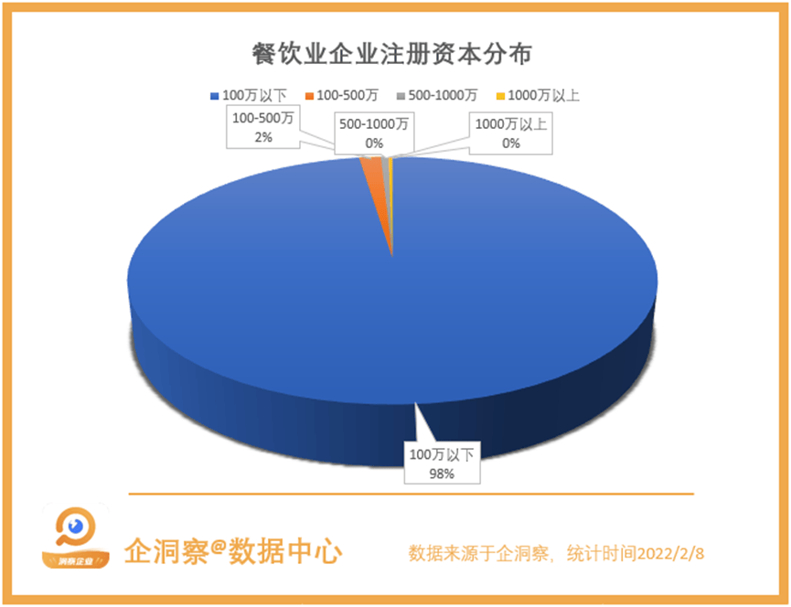 在注册资本方面,餐饮业作为经典的“小本生意”有98%的企业注册资本不足100万,注册资本在100-500万的餐饮业企业仅占总数的2%。但由于餐饮业企业数量实在太多,依旧有3.5万家餐饮业企业脱颖而出,成为了注册资本1000万以上的大型企业。