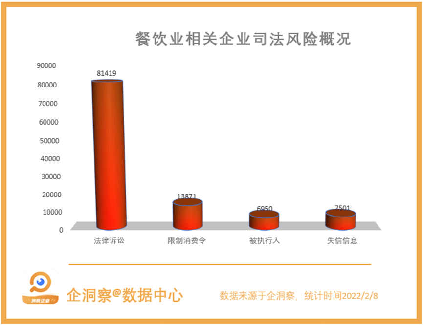 在司法风险方面,餐饮业企业涉诉数量也不高,虽然有8.1万家的餐饮业企业有涉诉记录,虽然数量很多,但在1200万家餐饮企业中,这8.1万家企业,仅餐饮业企业总数的0.65%。而有限消令、被执行人记录的企业数量也仅占企业总数的0.1%左右(±0.05%)