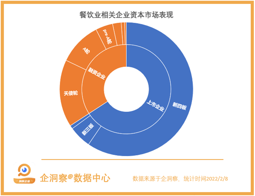 企洞察数据显示,虽然餐饮业企业数量较多,但不论是上市企业,还是处于融资阶段的企业数量都很少,上千万家餐饮企业中,上市企业总数仅有158家,这158家企业中还有143家企业处于新四板上市企业。而融资情况也同样惨淡,大多数处于融资阶段的餐饮企业,都处于B轮以下,处于天使轮的企业最多,有39家餐饮业企业。