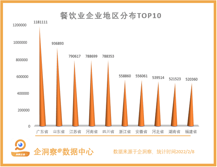 从地区分布来看,广东省最多,达到了118.1万家,其次是山东、江苏,位居全国第二,而全国餐饮业企业数量排名的前十中的前九名,为全国常住人口排名前十的省份,唯一的例外则是福建省。充分说明了常住人口对餐饮业企业的影响。