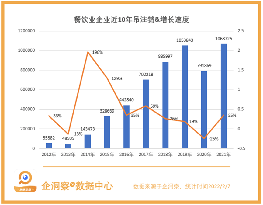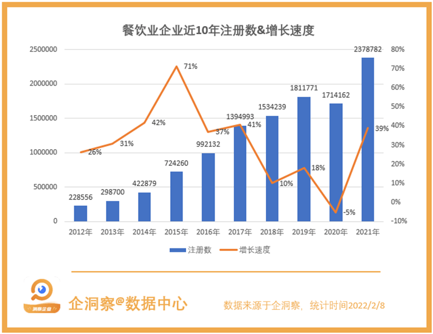 根据企洞察数据显示,我国现存1251.3万家餐饮业企业(包括个体工商户),其中2015年增速最快,达到了71%。而2021年新增企业数量最多,当年新增237.8万家企业。