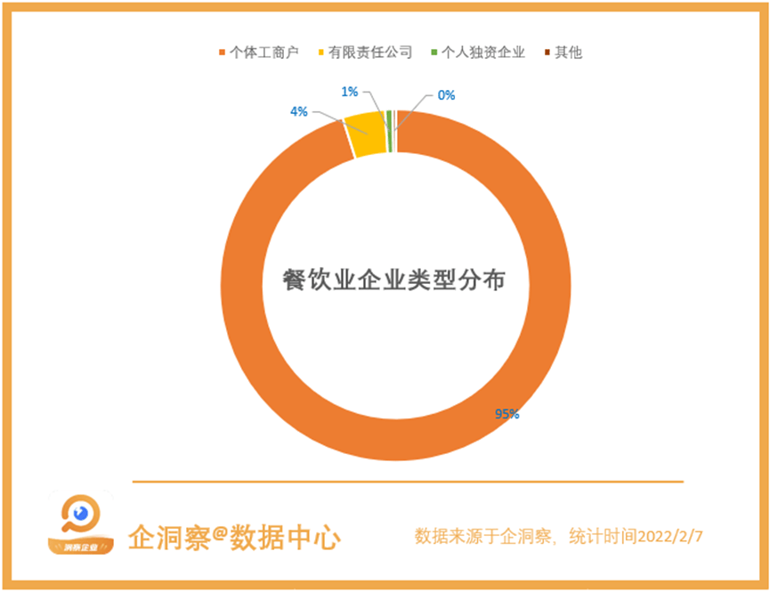企洞察数据显示,餐饮业企业有95%的企业均为个体工商户,仅有4%的企业类型为有限责任公司,个人独资公司仅占总数的1%。外商投资企业、联营企业等其他企业类型的数量甚至不足总数的0.5%。