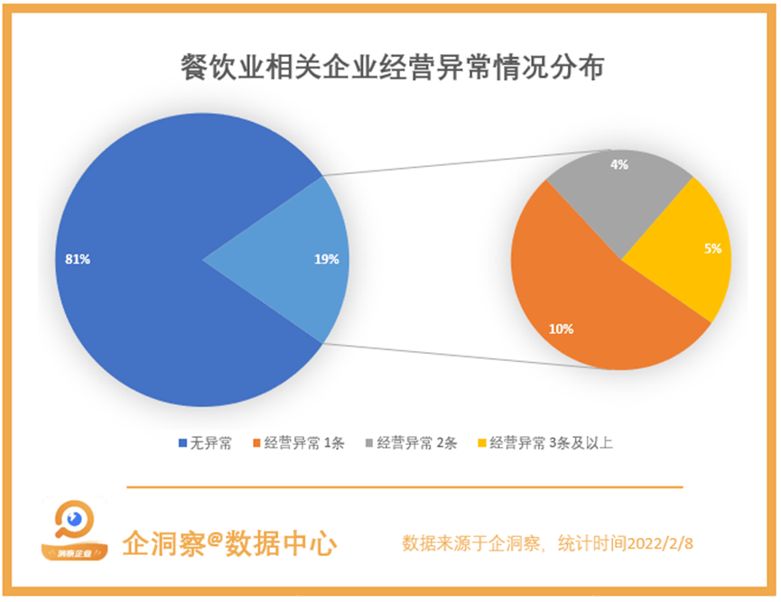 而作为小本生意,在加上部分人错估了餐饮业的竞争激烈程度 ,导致餐饮业的经营异常比例较高,有19.33%的餐饮业企业有经营异常的记录。其中有9%的企业有两条或两条以上的经营异常记录。