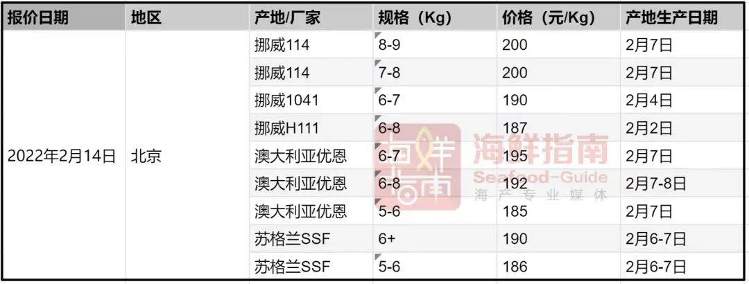今天(2月14日),北京冰鲜三文鱼报价为:7日生产8-9Kg规格挪威114报价200元/公斤;7日生产6-7Kg规格澳大利亚优恩报价195元/公斤;7日生产6+Kg规格苏格兰SSF报价190元/公斤。
