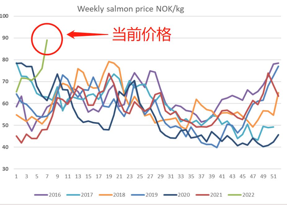 按常规情况,三文鱼价格高峰往往不会出现在2月份,但2022年2月以来的产地成本价格已超出许多人预料,甚至达历年1、2月份历史新高。“三文鱼价格正朝着有史以来的最高水平飞速上涨”,该报道中提到。