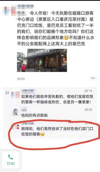 极目新闻记者注意到,13日晚9时许,微博博主“运河君”发布一张截图,截图中的文字称:“今天执勤在瓷器口游客中心旁边(原景区入口重庆沱茶对面)星巴克门口吃饭,星巴克员工看到吃了一半的我们,说你们能换个地方吃吗?你们这样会影响我们品牌形象……”当晚10时许,该博主继而发消息称,“星巴克居然投诉了在路边吃盒饭的民警……”