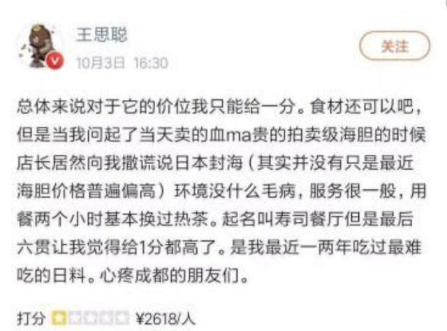 王思聪也在大众点评锤过日料店的海胆,2019年,他在成都春熙路的一家日本料理店消费了15708元,其中包括一份「拍卖级海胆」和六贯寿司,餐厅包括口味、环境、服务和食材的各项评分在某网站上均超过了9分。