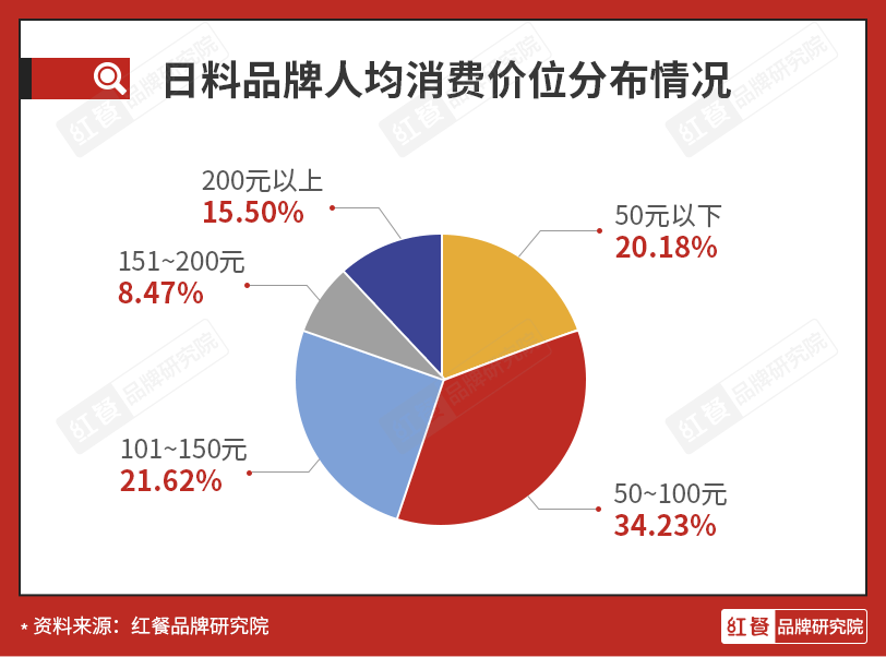 而在价格层面,红餐品牌研究院统计,101~150元的中高端日料比例为21.62%、151~200元的轻奢日料比例为8.47%、200元以上的高端日料比例为15.50%。中高端日料的占比达到了45.59%。