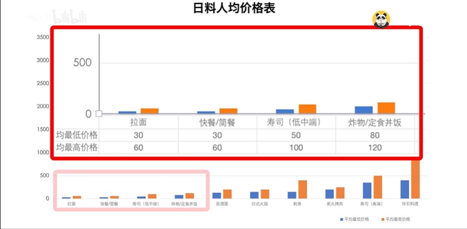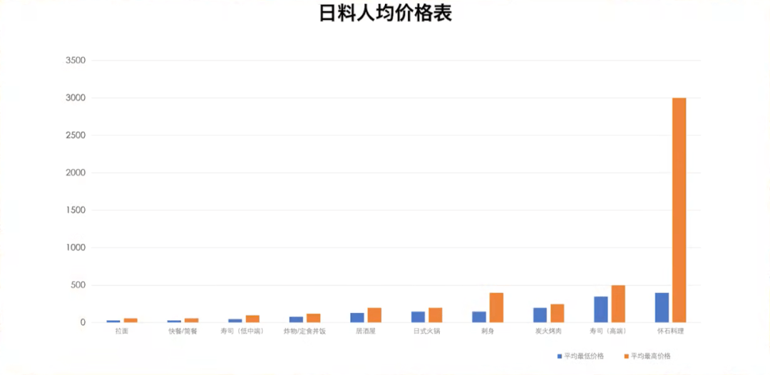 从图上就可以看出,低端日料包括快餐简餐、拉面、定食等,价格在人均50-100元;中端日料包括寿司、刺身、居酒屋等,人均100-300元;高端的是怀石料理,定价跨度很大,从400-3000元不等。