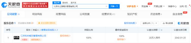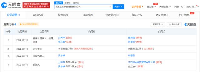 天眼查App显示,近日,北京乐之享餐饮管理有限公司发生工商变更,原自然人股东均退出,新增和府捞面关联公司江苏和府餐饮管理有限公司为股东,持股比例100%,同时,姚春刚担任该公司法定代表人、执行董事及经理,郭燕霞任监事。