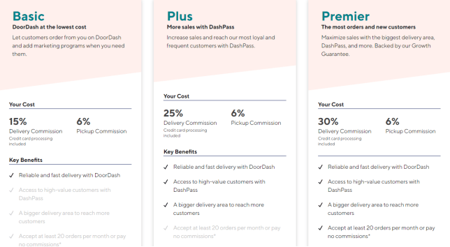 此前,《一点财经》曾研究过美国最大外卖配送平台DoorDash的费率透明化调整——收费项目分为固定6%比例的平台基础通道费(佣金)和不同比例的配送类佣金。其中,配送类佣金被划分为普通basic、优选Plus、精选Premier三级,其中普通的配送佣金15%,优选的配送佣金25%,精选的配送佣金30%,配送范围不断扩大。